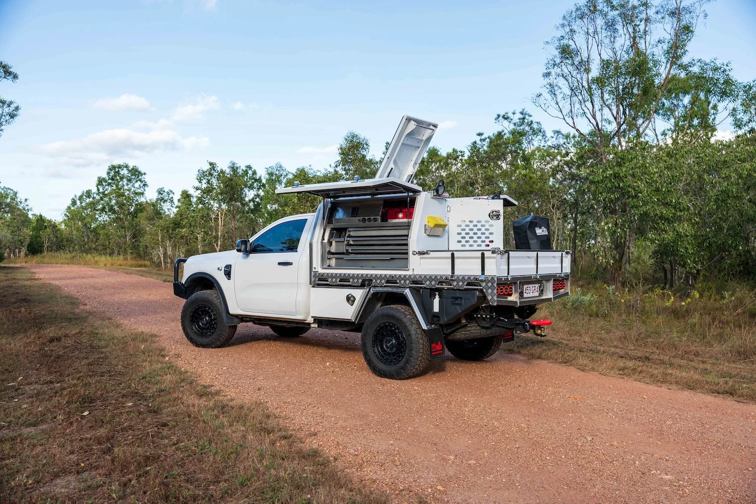 One of the setups we’re currently running in our fleet demo vehicles, is our Ford Ranger Single Cab with Deluxe Plus ROPS Tray with Diesel Fitter and Gullwing Toolboxes. Here’s a breakdown for you: