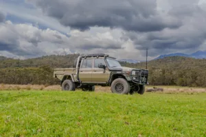 This Toyota LandCruiser 79 Dual Cab in French Vanilla with the Norweld Deluxe Plus Tray and Dual Gul..