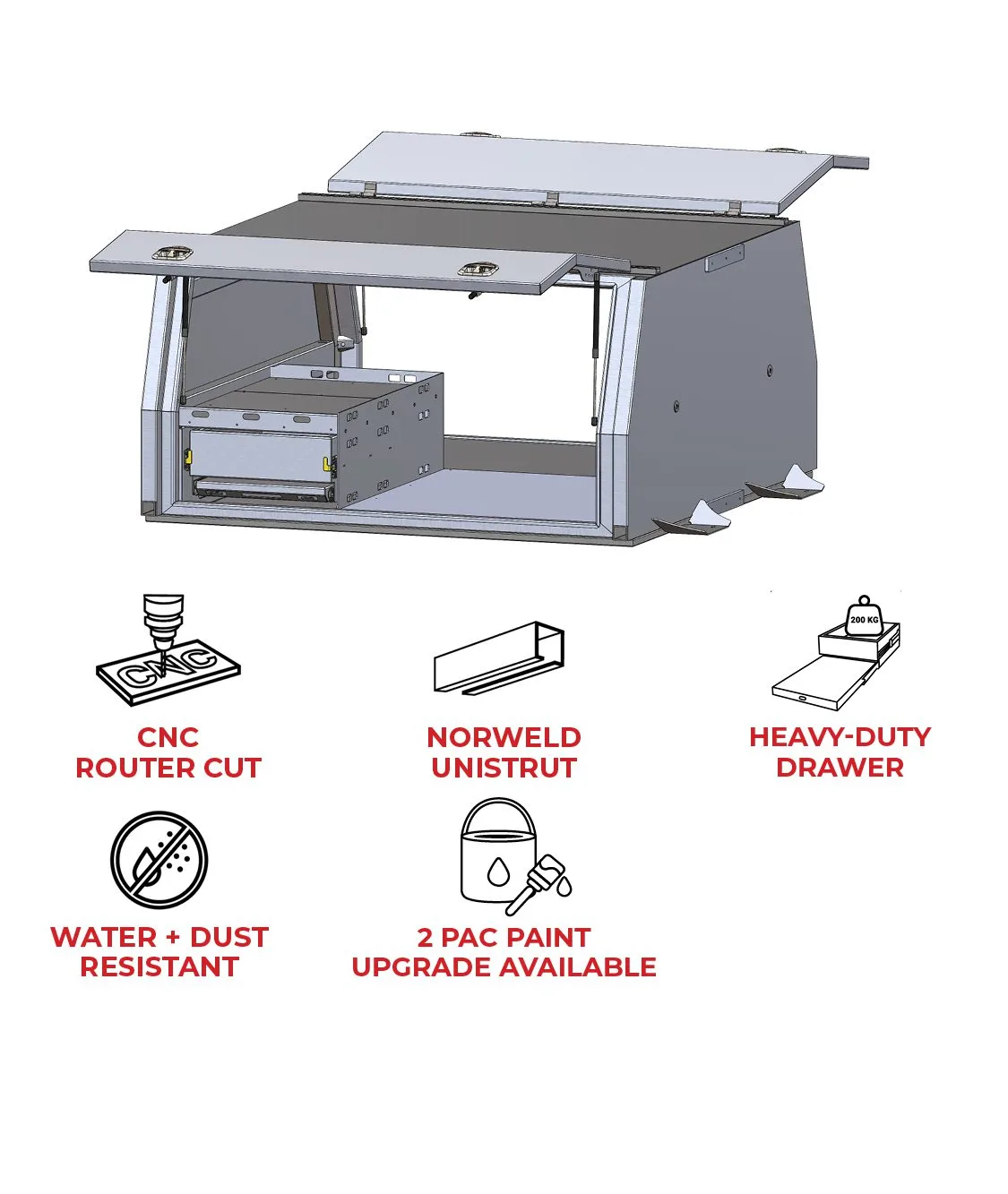 The Tradie 2 Door Cargo Canopy features a 510mm wide heavy-duty drawer and a convenient slide-out table, perfect for any job site. This setup offers ample storage while maintaining a sleek design. With a gutter system and rubber seals for dust and water resistance, it’s an ideal choice for any tradie ute canopy. 2 Door Cargo Canopy