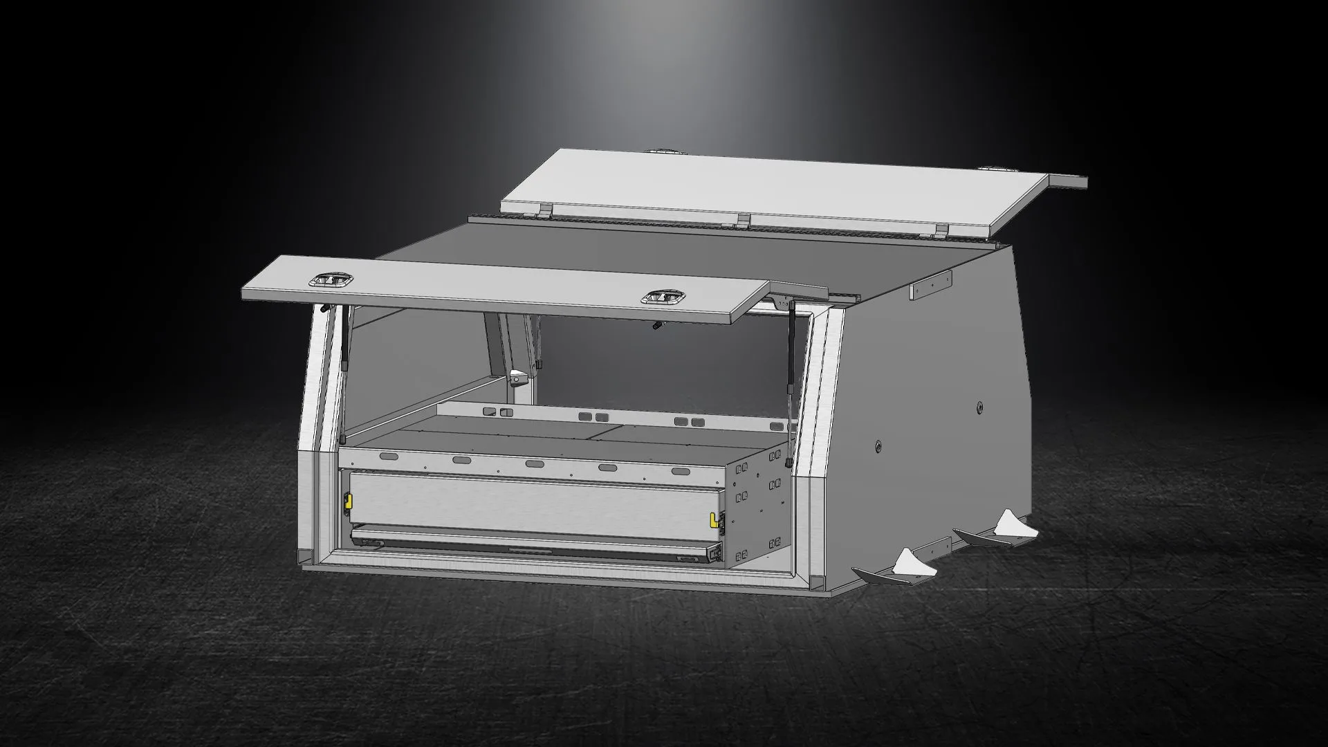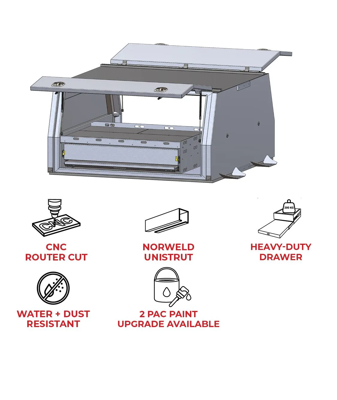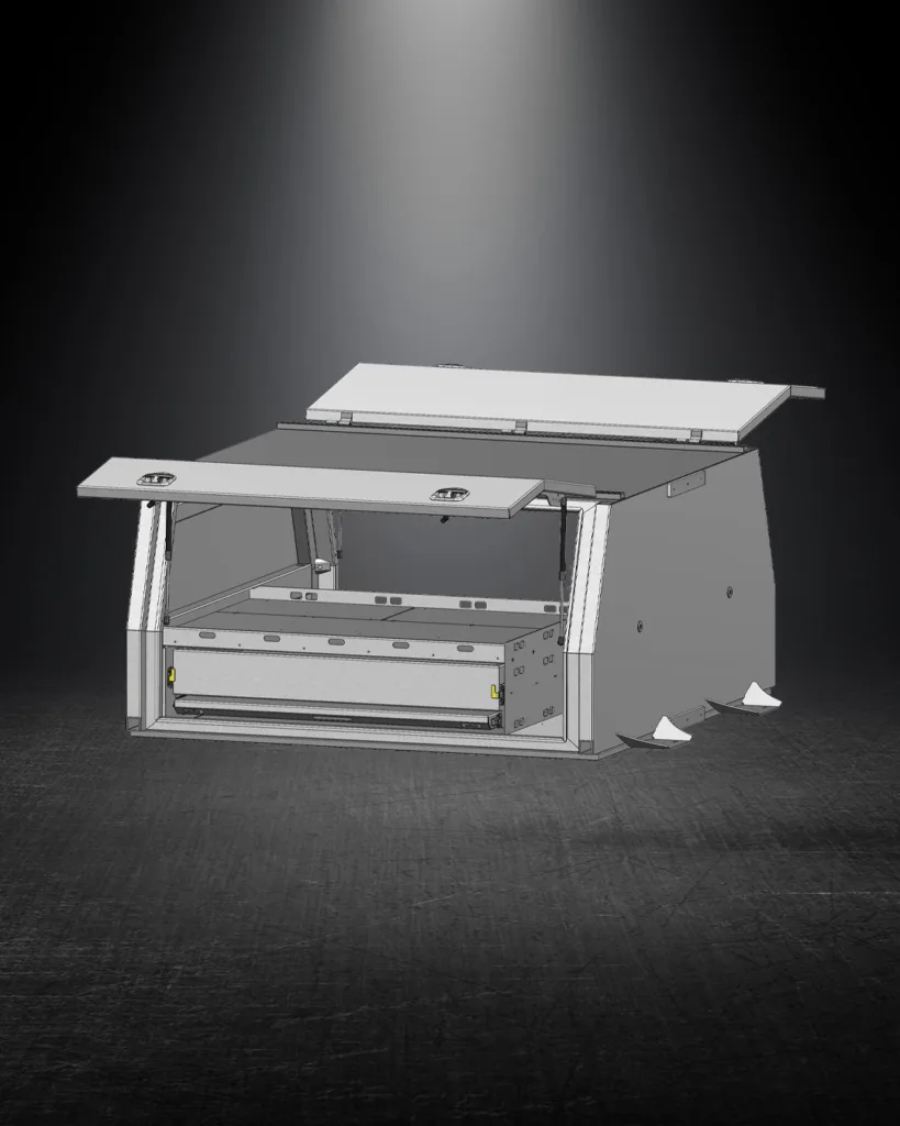 The Tradie 2 Door Contractor Canopy includes a spacious 1200mm wide heavy-duty drawer and slide-out table, making it perfect for tradies who need extra storage and functionality. This robust design ensures easy access to your tools, while the gutter system and rubber seals provide excellent dust and water resistance. 2 Door Contractor Canopy