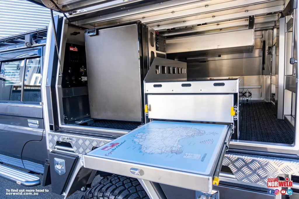 - Slide out Drawer/Table Combo on passenger side with hidden battery location
