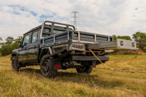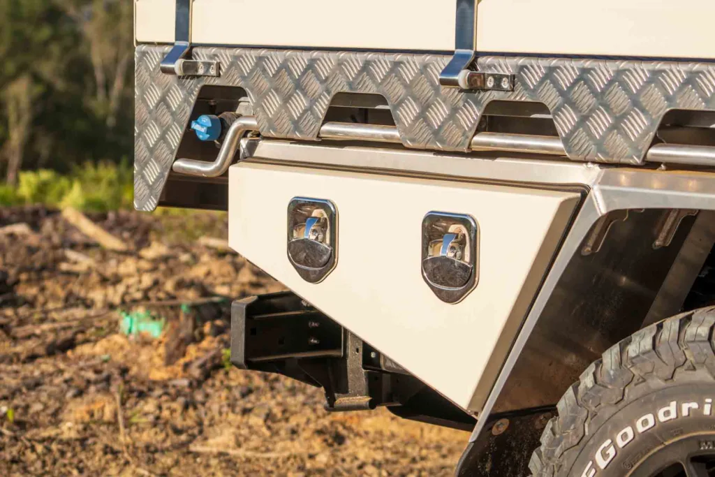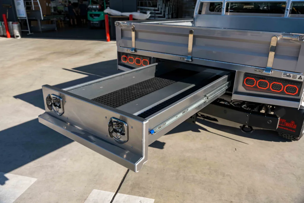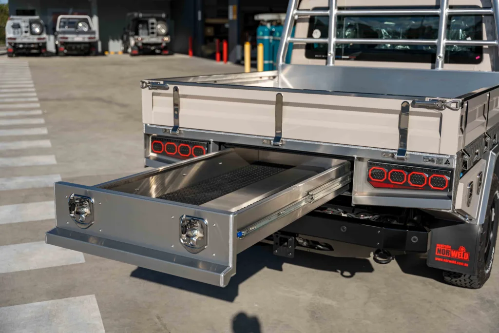 Store tools, shovels, spare parts or recovery gear in a 1200mm dust resistant trundle drawer. This drawer is tough and can with stand up to 200kg of weight.