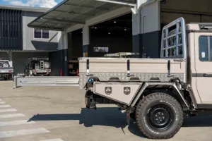 Our aluminium trays for the INEOS Grenadier Quartermaster are designed for long-lasting reliability and smooth performance. Rigorously tested over tens of thousands of kilometers, these trays meet the high standards of Norweld, which is why they come with a lifetime warranty on workmanship. The extensive list of standard features includes exclusive tail lights, twin spare wheel mounts, underbody toolboxes, and optional accessories like rear ladder racks and flush tie-down points.