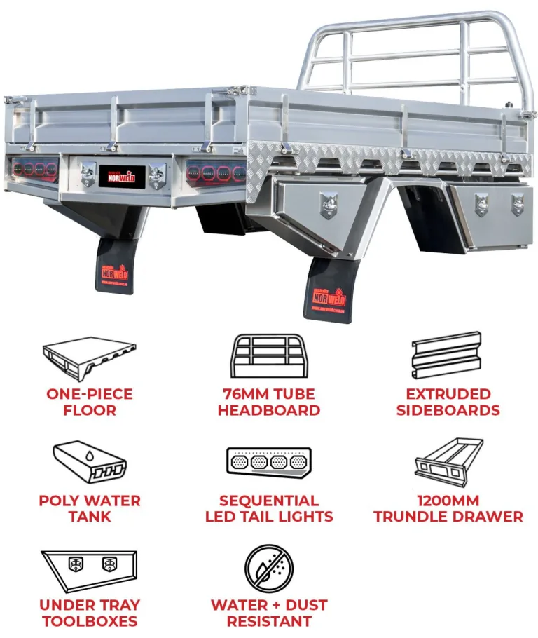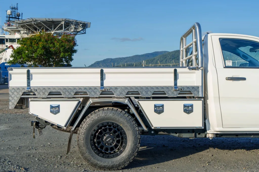 Made in Australia from a full welded aluminium construction that has been cut, folded and machined using CNC machinery, you can rely on our waterproof and dust-proof Nissan Navara Single Cab Tray’s Deluxe and Deluxe Plus packages to help you tackle your day-to-day challenges. With extruded sideboards, under-tray drawers, headboard and relocation kits for rear sensors and cameras, you can enjoy a tray designed to support you.