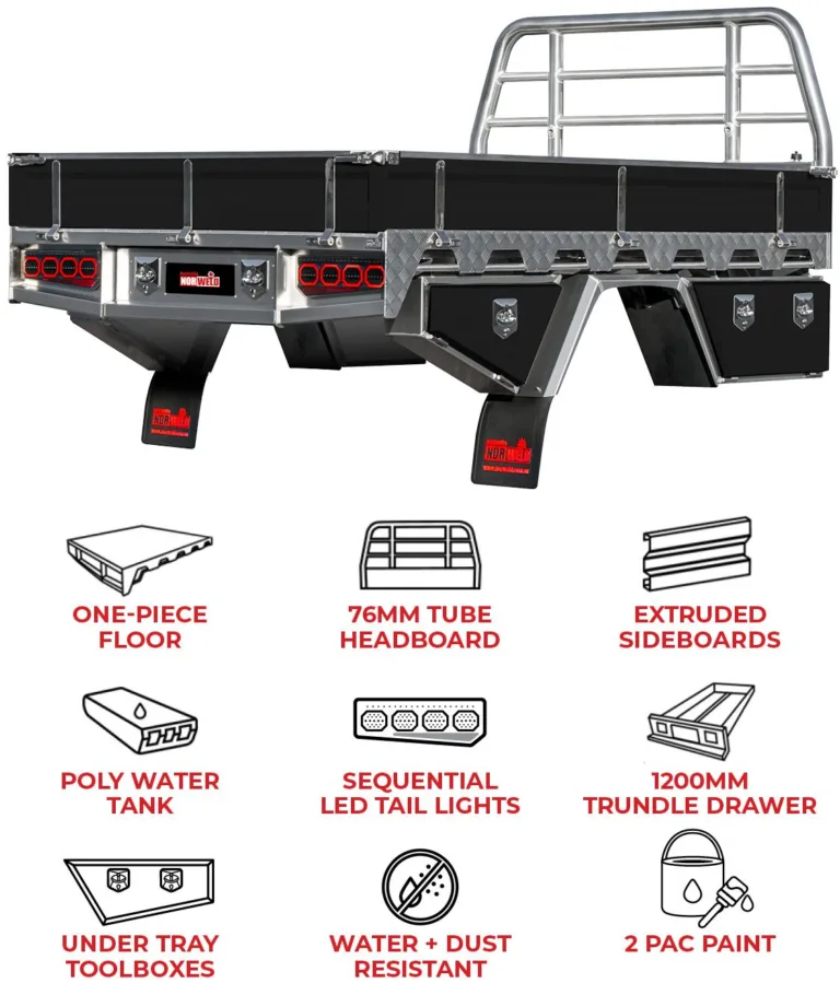 Our Nissan Navara Trays are designed to suit all NP300 Models from 2016 onwards due to our engineered tray mounts. Unfortunately we do not have any offerings available for the D22 or D40 models. If you are unsure about our compatibility for your vehicle, please contact our team. Our Nissan Navara ute trays come with a comprehensive lifetime warranty on workmanship. This serves as evidence of our dedication to delivering reliable and enduring solutions. Whether you’re navigating tough terrains or tackling heavy workloads, your investment in a Norweld tray is backed by our unwavering assurance. We aim to provide thorough service that ensures your Nissan Navara ute tray is fitted with expertise and primed for performance. When you visit our fitting centres in Cairns, Townsville, Brisbane, Sydney, Melbourne, Adelaide and Perth or through our various agents located around the country, our trained technicians will carefully install your ute tray, relocating your factory reverse camera, reverse sensors and radar. Rest assured that before you take to the road, we will make sure that your tray is professionally installed. At Norweld, our attention to detail shines through when it comes to Nissan Navara trays. Unlike trays that offer a one-size-fits-all approach with various canopies, we use a more precise method. Our recommendation is straightforward — opt for Norweld Nissan Navara canopies tailored to our trays or choose a standalone tray configuration. While this choice may narrow your options, it ensures that your Navara tray integrates seamlessly and operates with unwavering reliability. Your Navara deserves the best, and that’s precisely what we offer — a setup designed for excellence in every aspect, whether its function or form. Our tray sizes for the Nissan Navara come in: At Norweld, quality is our cornerstone, and it starts with the materials we choose for our Navara trays. With meticulous care, we build our trays from aluminium, a material revered for its remarkable blend of lightweight durability and corrosion resistance. The aluminium is tailor-made to conquer the demands of off-road journeys, heavy hauling and the unpredictable elements of the great outdoors. Every single component is thoughtfully engineered and crafted by our skilled experts, resulting in a Navara tray manufactured to go the distance. Upgrade your Nissan Navara with a Norweld tray built to handle the toughest conditions.TRAY FAQ’S