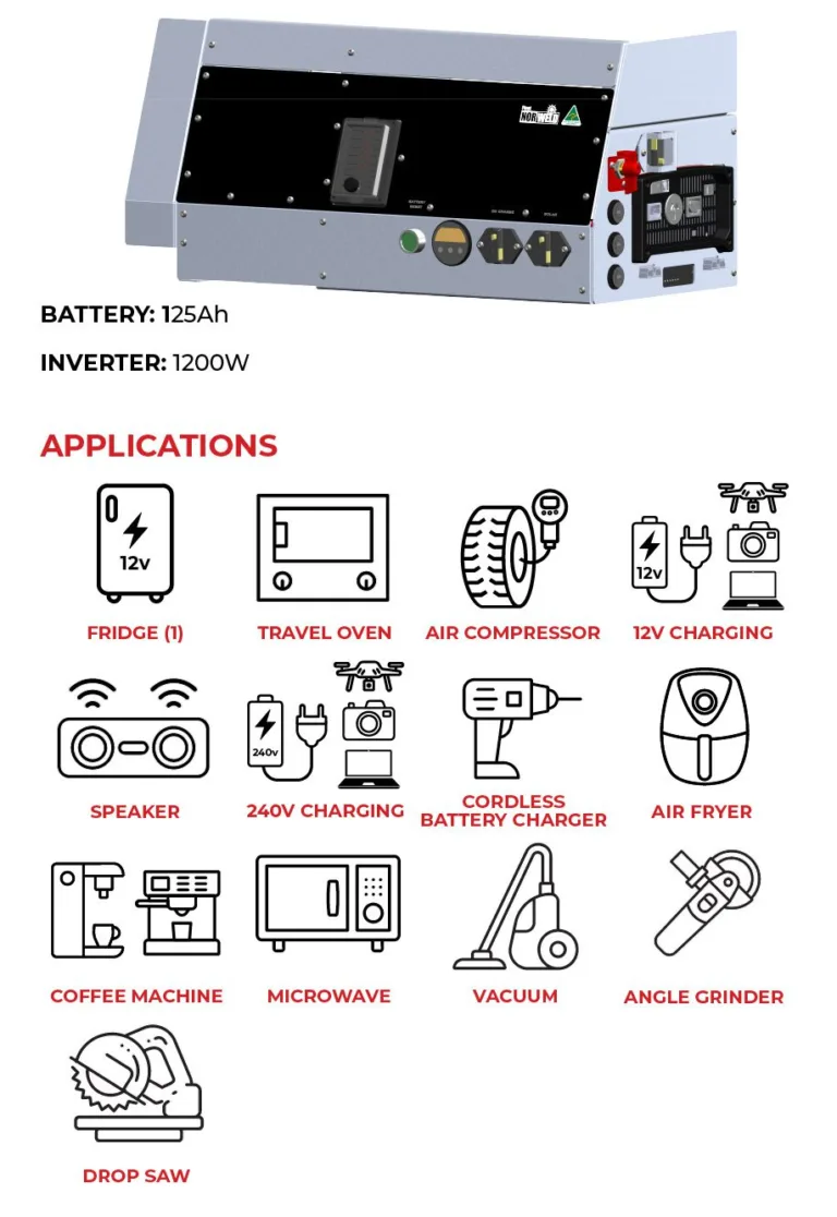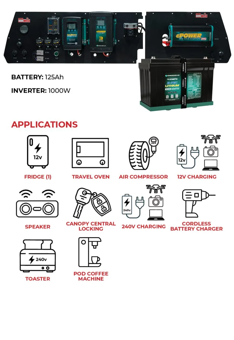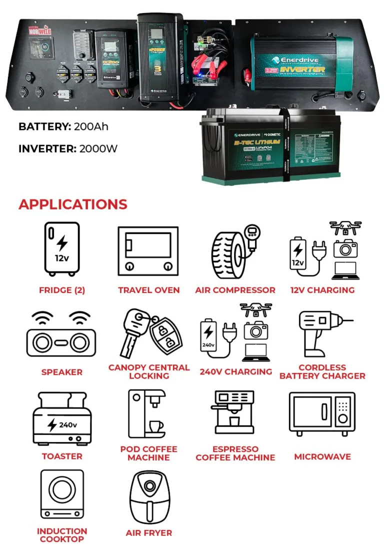 REDARC ENERDRIVE REDARC ENERDRIVE TOURER REDARC ENERDRIVE WEEKENDER GULLWING TOOLBOXES DESCRIPTION With a 2000W inverter this With a 2000W inverter this package can handle larger current drawing appliances like coffee machines and induction cooktops, as well as your 12 volt fridge, lights and charging your power tools, drones and computers With a 2000W inverter, increased battery capacity and the Manager 30 BMS this package can handle larger current drawing appliances such as a coffee machines, computer and induction cooktops, as well as your 12 volt fridge, lights and charging your tools With a 1000W inverter this package can handle smaller current drawing tasks such as charging your power tools, drones and computers, as well as powering your 12 volt fridges, lights and accessories With a 2000W inverter this Powers your 12V fridge, lights, Travel Buddy Oven and canopy's central locking for short trips With a 1200W inverter this package can handle larger current drawing appliances like coffee machine, microwave and induction cooktop, as well medium draw applicances like cordelss battery charger, as well as power drones, laptop and bluetooth speaker SPECS Lithium Battery 2x200Ah B-TEC, giving 400Ah of power 200Ah B-TEC 200Ah B-TEC 125Ah B-TEC 200Ah B-TEC 100Ah B-TEC 125Ah B-tec Battery Monitoring Redarc Redvision Simarine display Redarc Redvision ePRO+ Enerdrive Epro ePRO+ ePRO+ Charging 30BMS AC-to-DC BCDC1250 40Ah DC-to-DC 60Ah AC 30BMS AC-to-DC 40Ah DC-to-DC 50A BCDC Alpha Charger with Start Battery Charge Back option 40Ah DC-to-DC 25Ah DC-to-DC Inverter 2000W RS3 pure sine wave 2000W pure sine wave 2000W RS3 pure sine wave 1000W pure sine wave 2000W RS3 pure sine wave - 1200W pure sine wave 240V Input For shore and generator power For shore and generator power For shore and generator power For shore and generator power - - - Tri-colour dimmable door lights Aluminium Multi-Fit Battery Tray USB Ports 4 4 4 4 4 2 4 12V Sockets 2 2 2 2 1 1 1 Engel Sockets 1 1 1 1 N/A 1 N/A 2 x Anderson Plugs Connected to Vehicle CrankingWiring Comparison Table