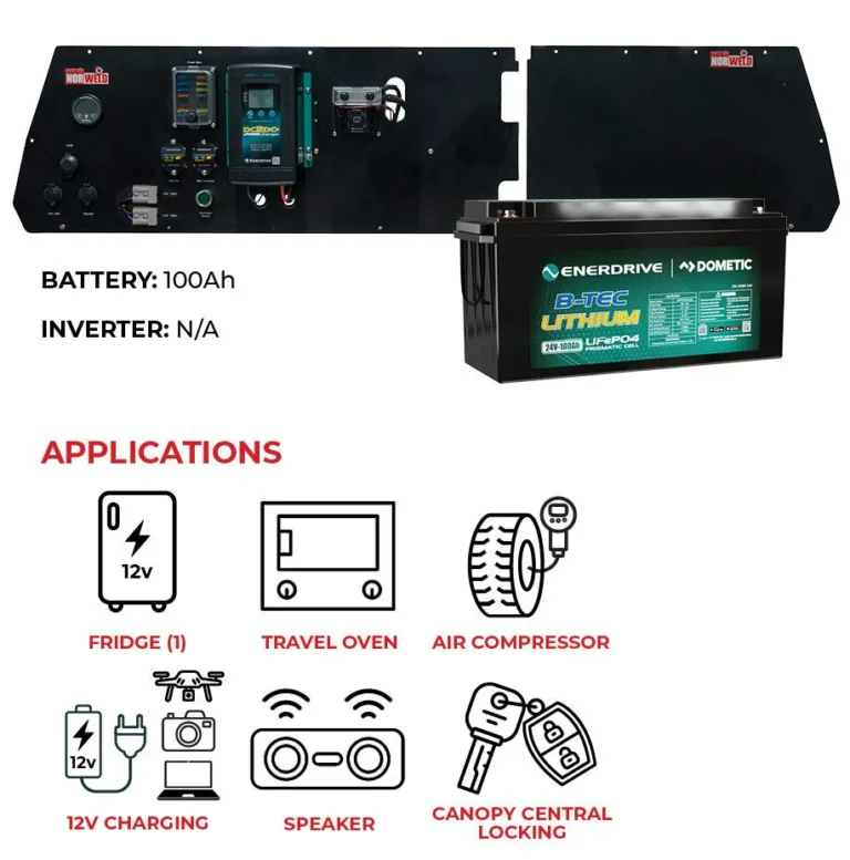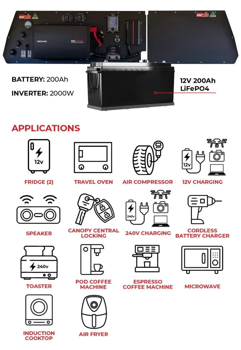 No Norweld Canopy Package is complete without one of our Canopy wiring packages. These kits are designed to cater for general everyday use through to the more serious overlander and long distance traveller. New in 2021, is the change to Lithium batteries, offering significantly faster charge rates and more usable capacity all whilst saving weight. Lithium batteries really are a step above the old AGM batteries, making sure your campsite is lit up every night.
